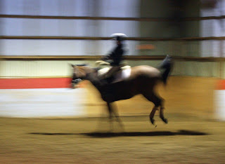 His knee is totally sound but he's a wee bit stiff from spending all that time in his stall. Coach and rider are working him back into his regular routine slowly. Currently he spends most of his time at the trot, crow hopping, shaking his head, bucking and generally being very sassy. Rachel spends most of her time laughing at his antics and hanging on!