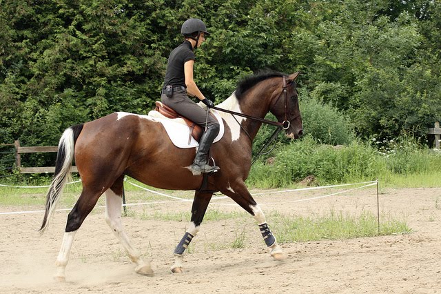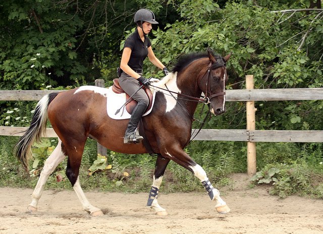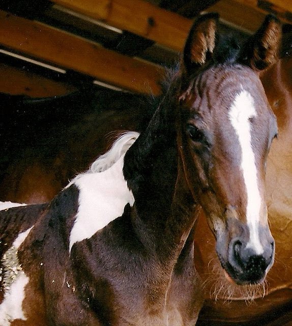 Several years ago, Rachel was riding out of Stevens Creek Farm and was coached by Teddie Laframboise. While there, she was lucky enough to witness the birth of several babies. One of the first was a lovely paint colt sired by Tricolore (KPWN) x Mistrale a TB mare. Wonderful temperament from the time his tiny hooves hit the ground he was and still is a favourite at the farm.