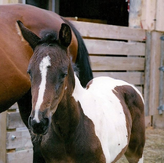Several years ago, Rachel was riding out of Stevens Creek Farm and was coached by Teddie Laframboise. While there, she was lucky enough to witness the birth of several babies. One of the first was a lovely paint colt sired by Tricolore (KPWN) x Mistrale a TB mare. Wonderful temperament from the time his tiny hooves hit the ground he was and still is a favourite at the farm.